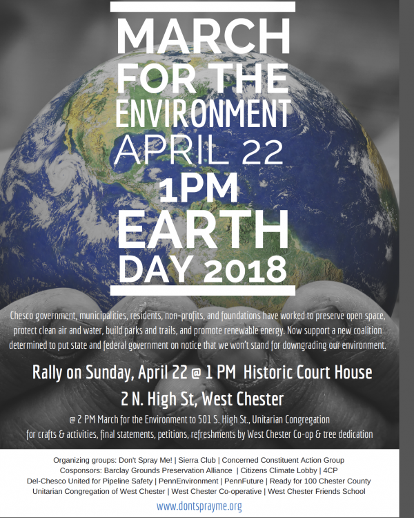 We did it last year, with 200 attendees, great speeches and an effective march. Now we are aiming for at least 100 more people to rally and march in West Chester on Earth Day, April 22!