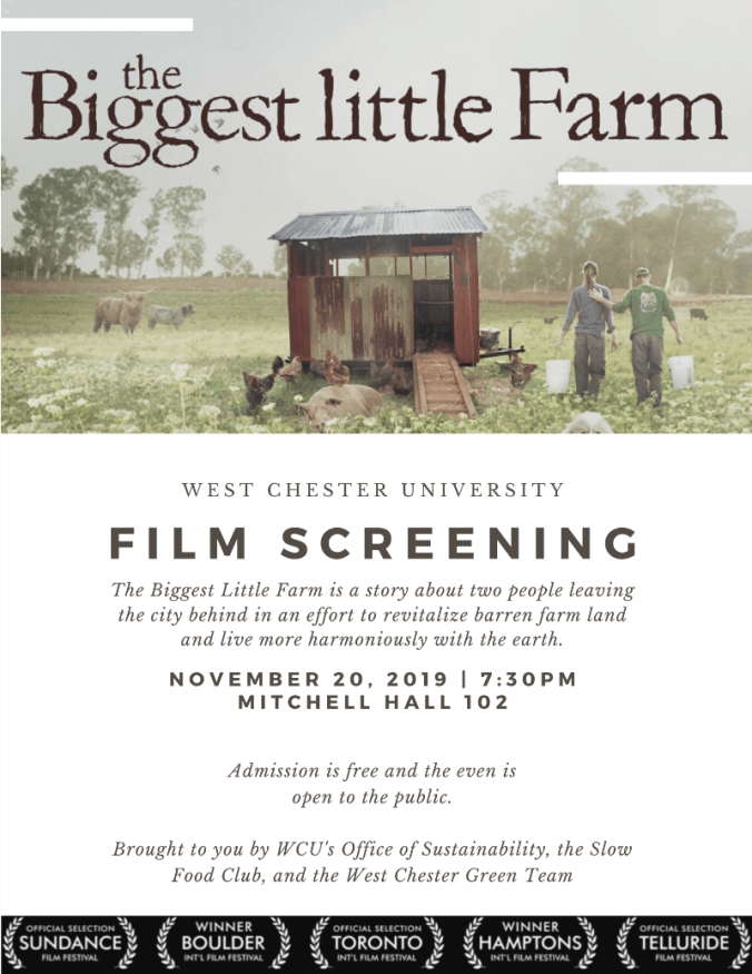Sponsored by the Office of Sustainability, the Slow Food Club, and the West Chester Green Team. See trailer at https://www.biggestlittlefarmmovie.com/videos/.
