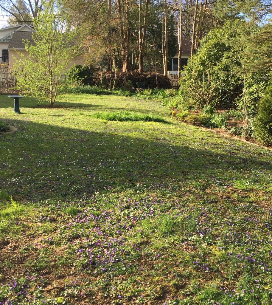 A lawn never subjected to chemicals can exhibit a broad and attractive range of plants, here featuring purple and white wild violets (and, in the middle distance, an area of meadow hyacinths that will soon bloom in purple and white):