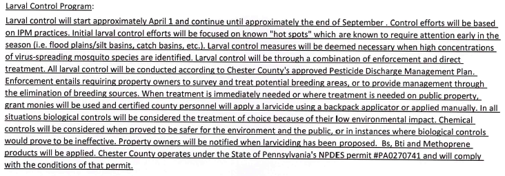 PA West Nile website home page extols the benefits of larviciding. Indeed, larval control is an important part of the Chester County Health Department’s 2018 application for a grant from PA DEP (download here: DEP DH contract for 2018: