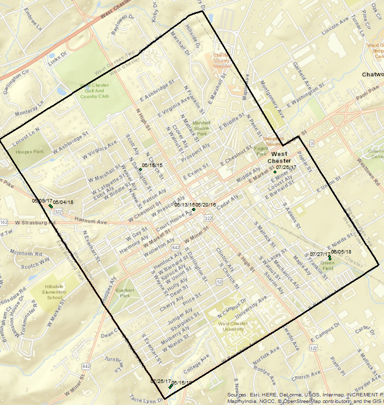 So wouldn’t we expect that the County would be regularly larviciding in West Chester Borough, which the Health Department has been regularly identifying as having high “Vector Indexes” (likely from breeding in storm drains)? Unfortunately not. In fact, the County has conducted only ten larvicide events in the Borough in the last 4 years! See the locationsn black on this map constructed by the 2018 Don’t Spray Me! / Sierra Club intern Kyle Erisman on the basis of geographical coordinates obtained by a Right To Know request to the PA DEP: